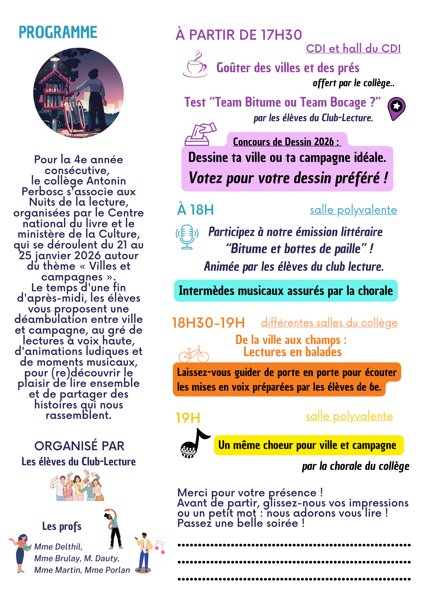 Un grand bravo aux 20 élèves du Club-Lecture, aux 40 élèves de 6e et aux 25 choristes et musiciens mobilisés pour cette soirée réussie, où textes et chansons ont magnifiquement relié mondes urbain et rural. Un merci chaleureux aux professeurs encadrants ainsi qu’aux agents mobilisés pour l’organisation, les installations et le goûter, et enfin merci à tous les invités pour leur présence et leurs mots d’encouragement qui donnent déjà envie de préparer la prochaine édition !